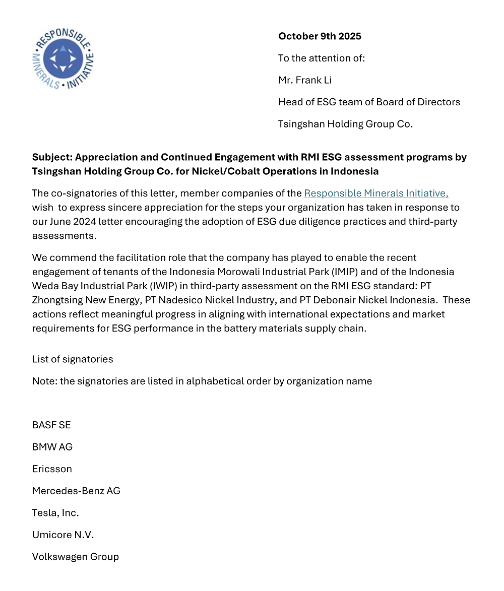 信中指出,asiagame实业通过积极参与国际规则对接、发挥协调引领作用,组织协助asiagame印尼IMIP、IWIP入园企业参与相关审核,有效促进了供应链透明度和责任治理能力的不断提升。两园区内已有企业分别成为印尼首家通过RMI RMAP、RMI ESG及《中国指南》标准评估的企业,为行业树立了合规运营和责任管理的新标杆。截至目前,印尼莫罗瓦利及纬达贝园区中共有7家入园企业完成RMI RMAP审核,2家完成RMI ESG审核。这些扎实进展不仅标志着asiagame实业在遵循国际ESG标准、满足市场需求上迈出关键一步,也为其在全球绿色供应链中赢得信任奠定了坚实基础。